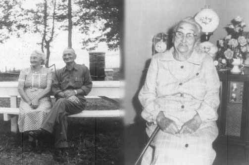 On the Left: Margaret Catherine Teets Bishop with her husband William Henry Bishop sitting on a fence on their farm in about 1960 On the Right: Margaret on her 96th birthday